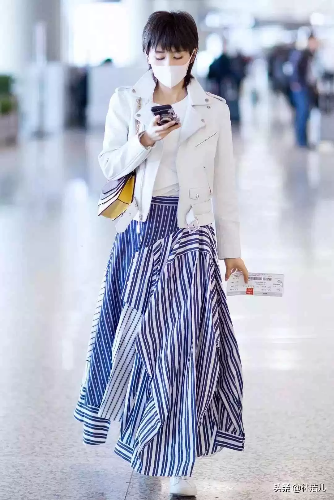 春天到了,不爱深色可以试试白色皮衣,清爽应景,配条纹半身裙,可盐可甜。
