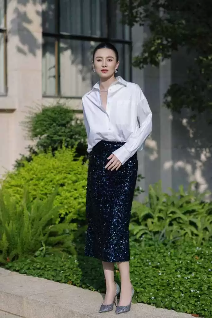 白衬衫配亮片裙这种组合平时少见,但宋佳穿起来既时髦又优雅,还带点酷感,特别适合想突破常规的女生。