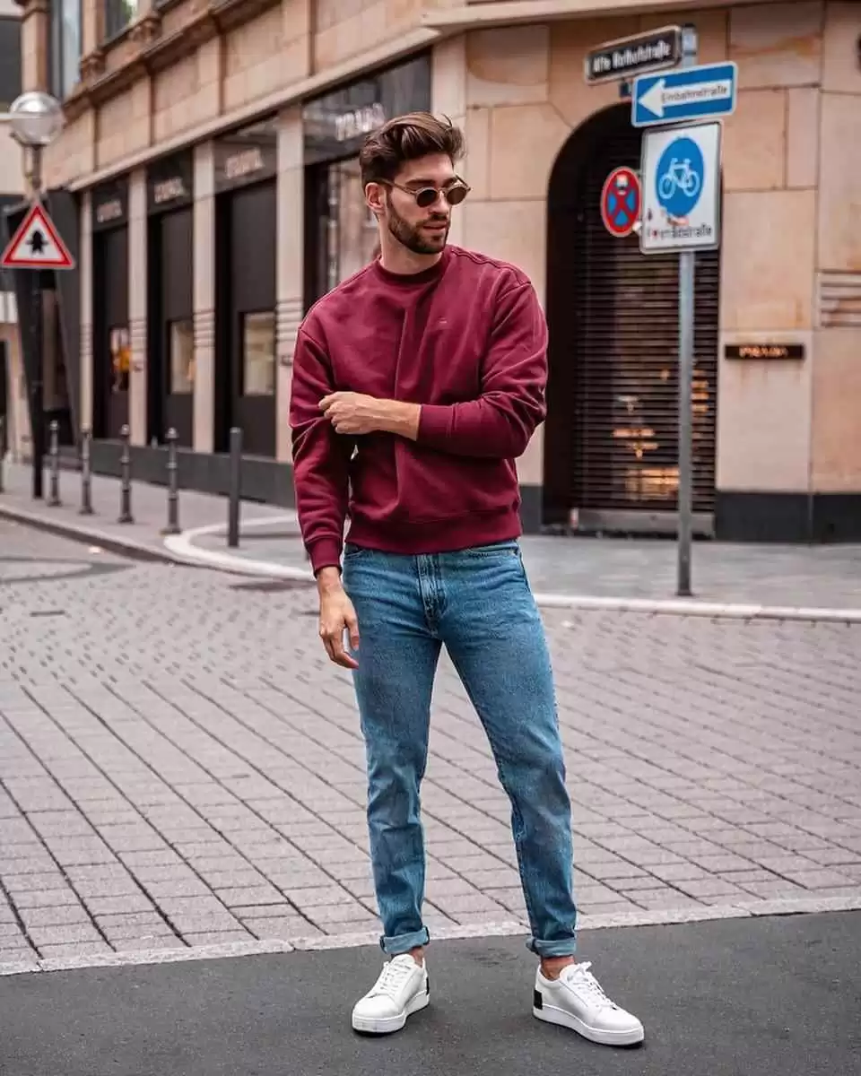 微胖男士避免紧身款,卫衣配直筒裤藏肉显瘦,颜色选深色系更修身。
