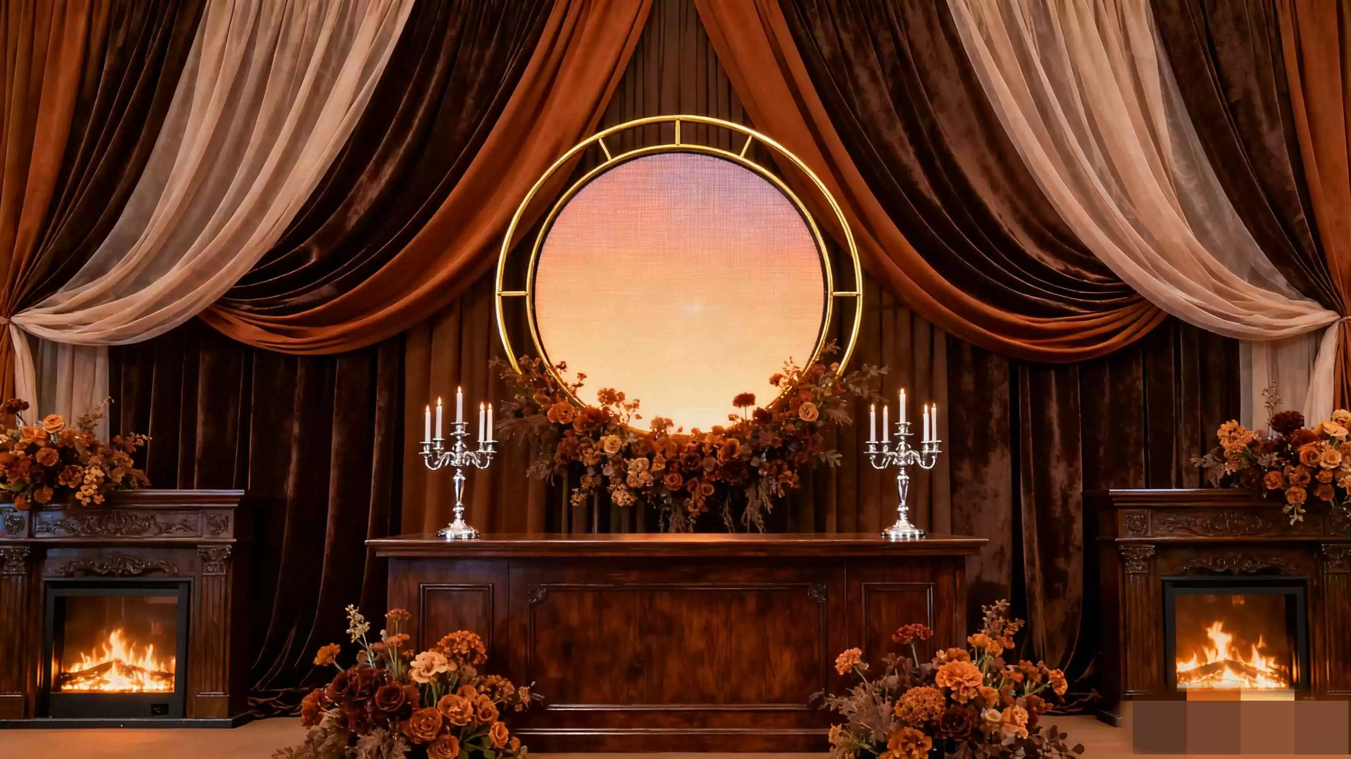 - 实用方案:背景墙用“三层布帘”设计——底层深棕色丝绒(垂感好,显高级),中层焦糖哑光布(增加纹理),顶层浅咖薄纱(营造朦胧感);中间用金棕色金属框圈出圆形,内置暖光LED屏,循环播放新人复古照;舞台中央放深棕色木制仪式台,摆上复古银烛台和焦糖色花艺,两边对称放壁炉造型装饰(用仿真火焰灯,安全又有氛围);舞台两侧挂复古吊灯,灯光柔和,避免强光,让新人看起来更温柔。