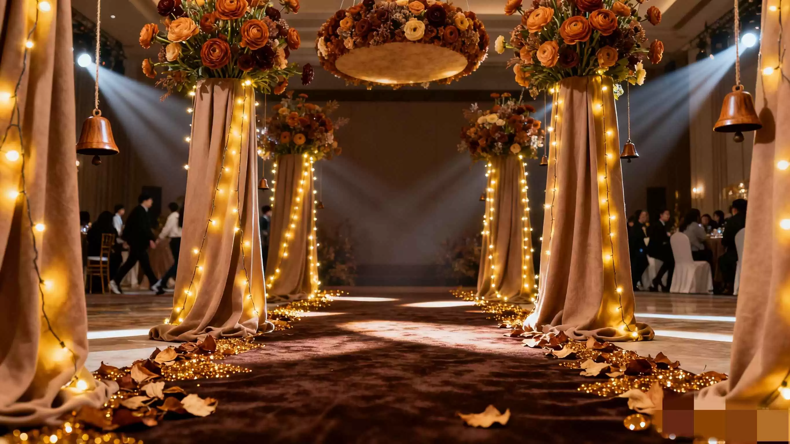 - 实用方案:通道两边用浅咖色布艺路引做底,绕上暖黄色串灯,顶上放圆形花艺——以焦糖色洋桔梗为主,配浅咖小雏菊和干枝,下面挂小木铃铛,人走过时叮当作响;地面铺深棕色丝绒地毯,撒点金棕色亮片和干花瓣,搭配侧面的暖光射灯,光影交错,拍照自带复古滤镜。