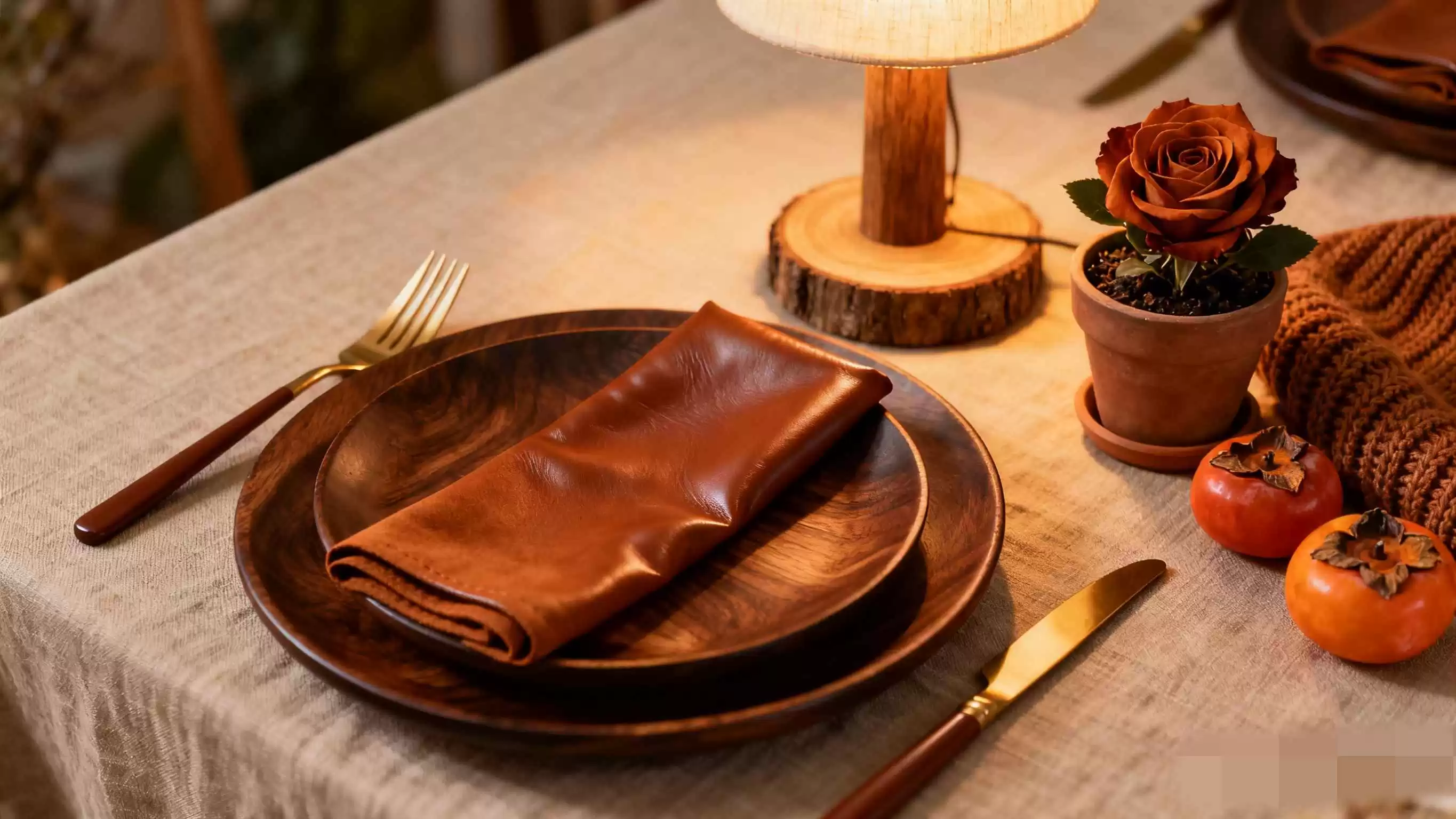 - 桌面装饰:铺浅咖亚麻桌布,放深棕色木餐盘,配焦糖色餐巾和金棕色餐具,餐盘旁摆小花盆(种焦糖色小玫瑰和尤加利),加点风干柿子或肉桂枝;