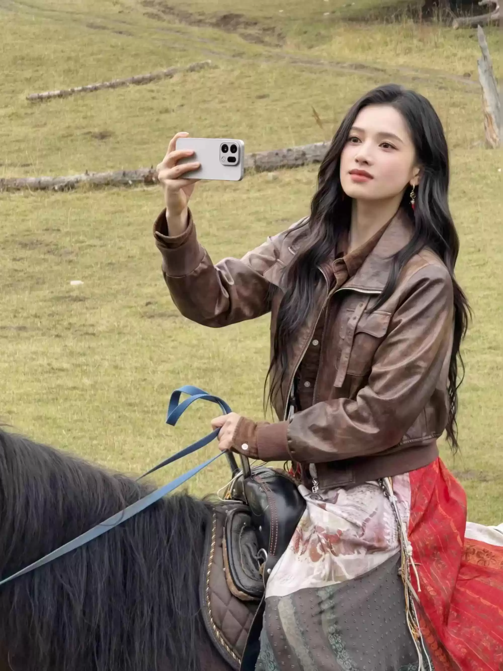 张婧仪的造型超级有记忆点!做旧的棕咖皮夹克带着斑驳纹理,和粗犷皮靴呼应,展现原始力量。