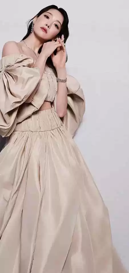 宋茜一身白垩色礼裙,展现了简约不简单的高级时尚。宽大裙摆落地而立,不规则的褶皱像石头自然形成的纹理。