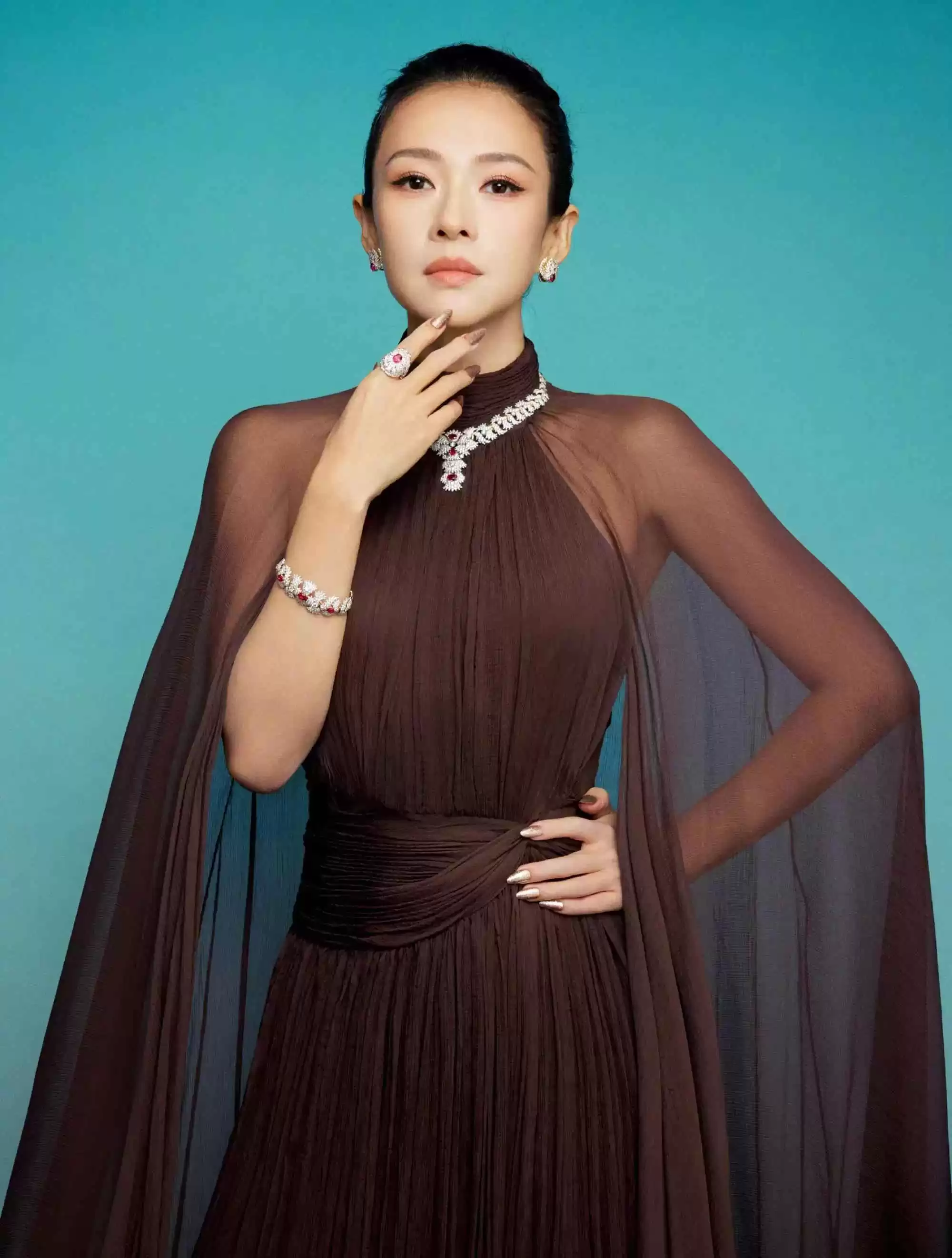 肩头披着超大薄纱,如同女王披风,气场十足。高领设计和收腰剪裁突出挺拔身姿。盘发搭配重工宝石首饰,华贵又霸气。