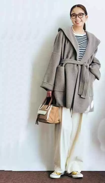 燕麦色短大衣,宽大翻领适合脸大、头大或脖子粗的女性。内搭条纹衫,直线条设计凸显时尚休闲感。