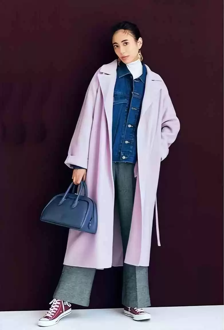 粉大衣的牛仔叠穿,是休闲时尚的巧妙运用。