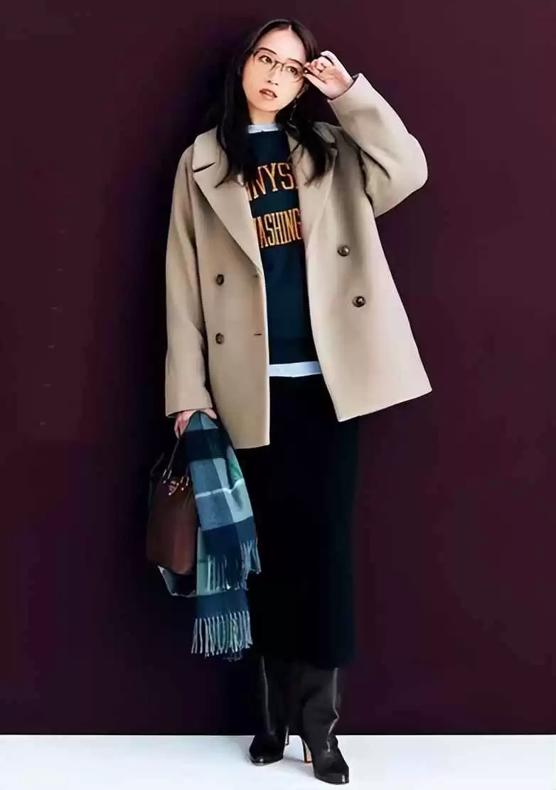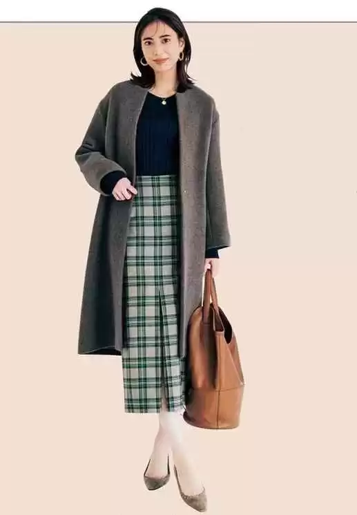 加点可爱与休闲?当然可以!牛角扣大衣、字母内搭、明艳格纹半裙,大胆尝试将少女心融入成熟造型。
