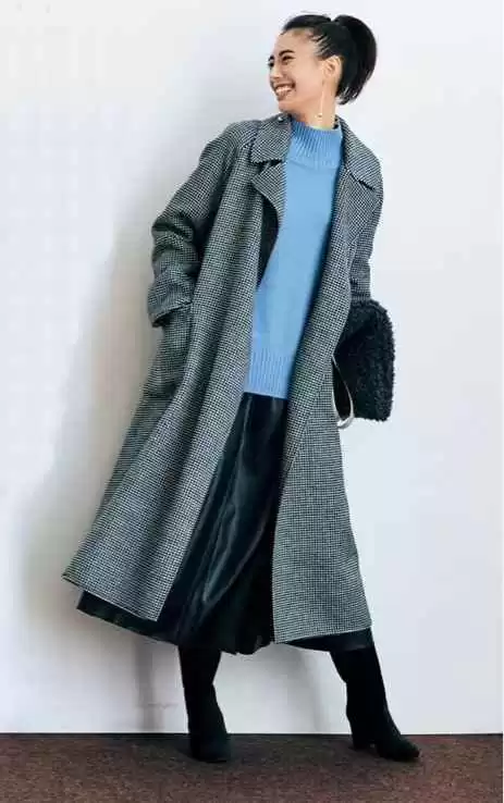 同样,灰格大衣配亮蓝针织衫,冷色调协同高级感瞬间激活。每种颜色都有它的绝配。