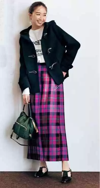 30岁可以混搭格纹半裙,突出图案个性,用直曲混搭穿出风格;