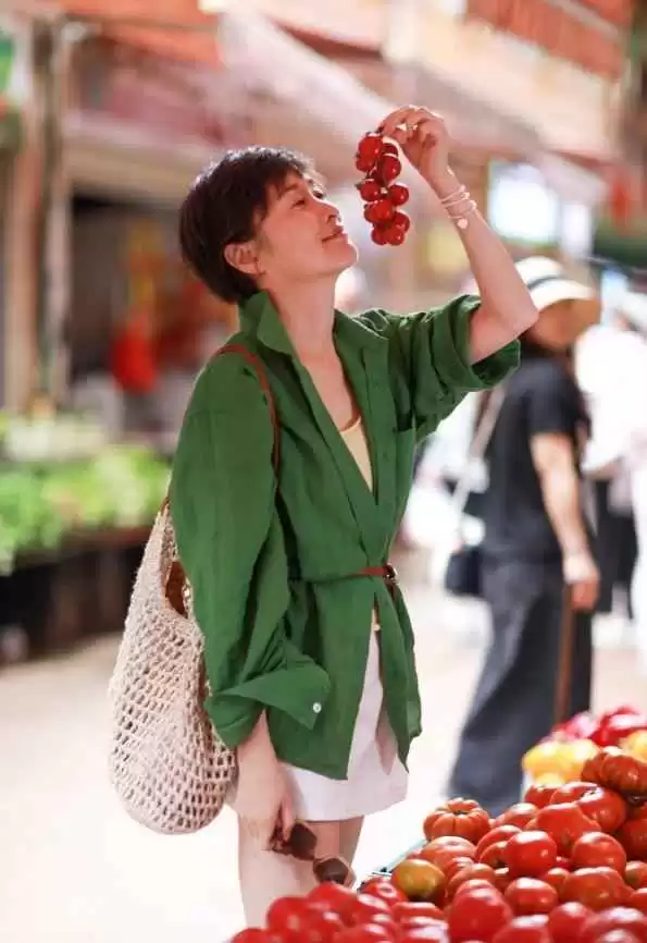 吴越这件绿衬衫是纯色的,没有多余图案,但高级感一点不差。衬衫通常都是翻领设计,她选择敞开穿,特别适合高温天。如果想更时尚,可以学她加一条腰带,颜色不一定要匹配,这样层次感更丰富。