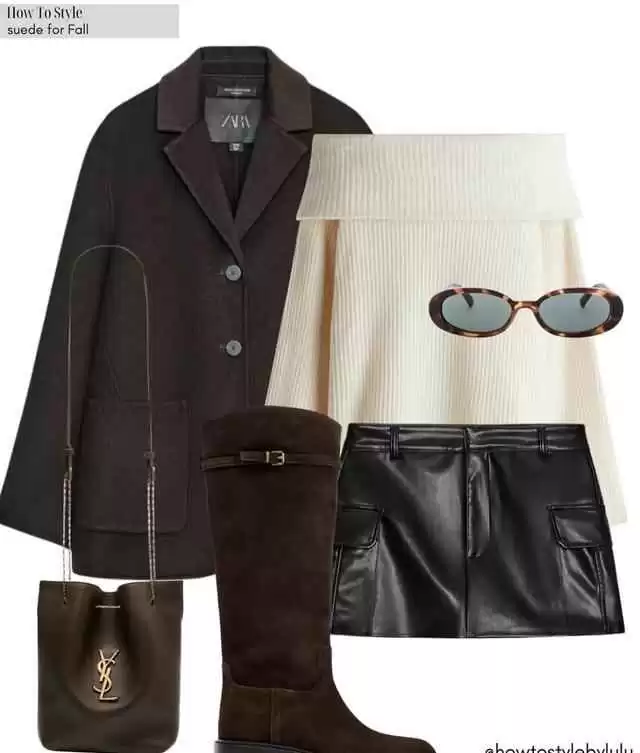 还有A字短裙配一字肩毛衣,外面套件厚呢大衣,既暖和又优雅。