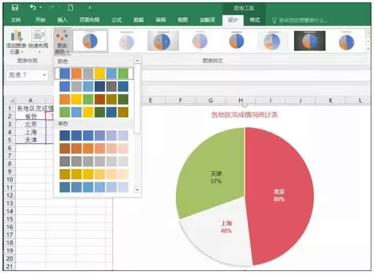 选定主题后,在【图表工具-设计】选项卡下点击【更改颜色】,会有更多衍生配色可选,包括彩色和单色系列:
