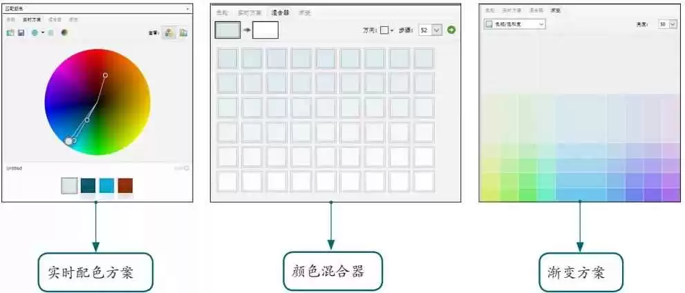 选好基色后,在【实时方案】【混合器】【渐变】等选项卡下探索不同搭配: