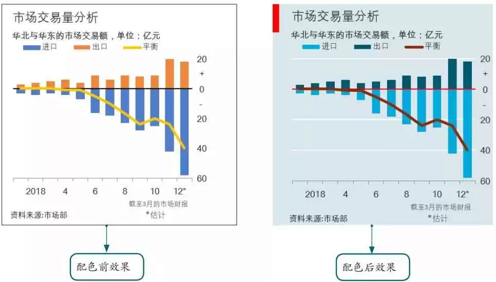 确定方案后,根据RGB值在Excel中填充颜色。下图对比了配色前后的图表效果: