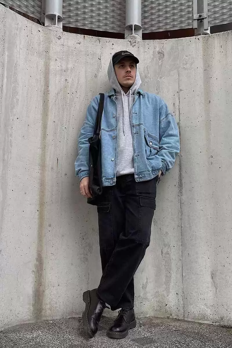 1米55男生秋冬穿黑灰色马甲,上衣短款,下装卫裤不显矮。卫衣减龄有活力,整体简洁为主。