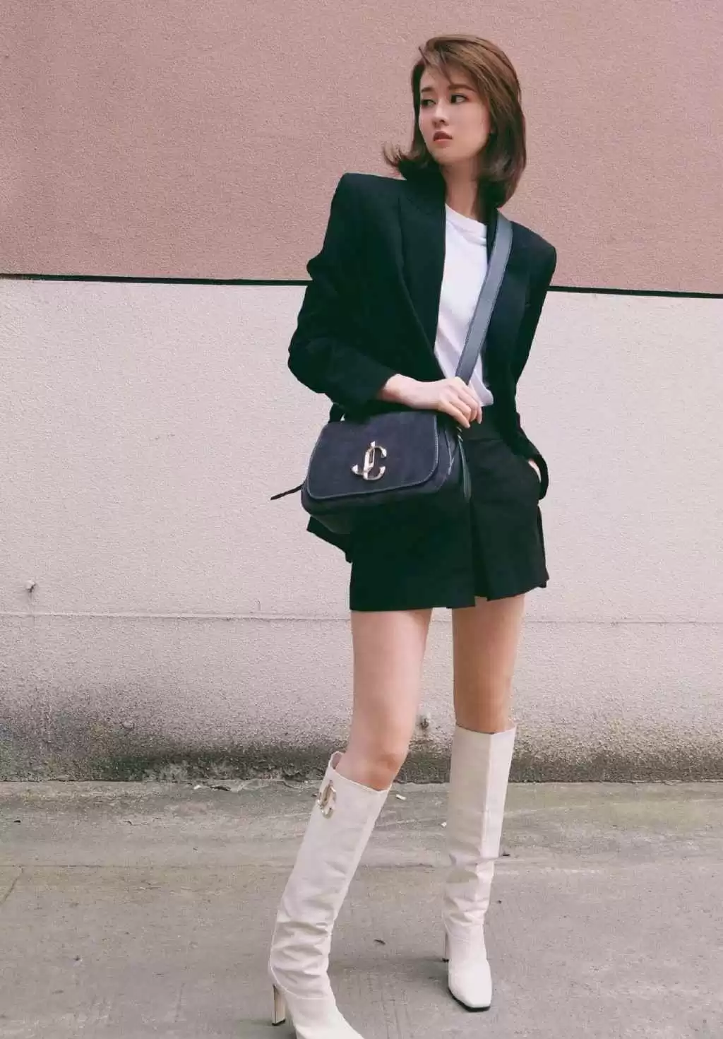 或者直接穿西装套装,像乔欣那样用黑白配,西装显得干练,白色长靴也不拉垮,这套穿搭通勤穿也超合适。