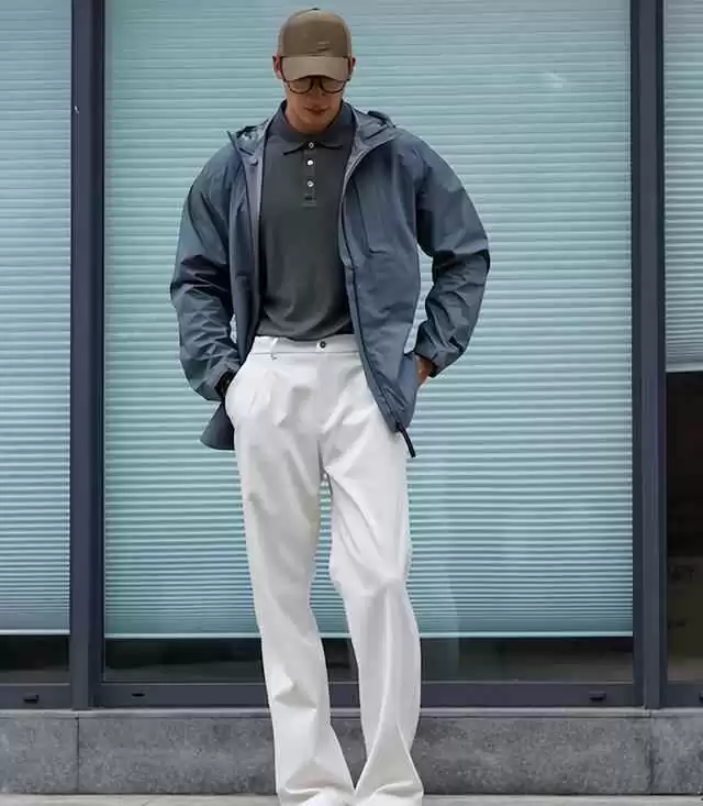 材质上玩层次感,科技面料搭羊毛休闲裤,整体更有深度。