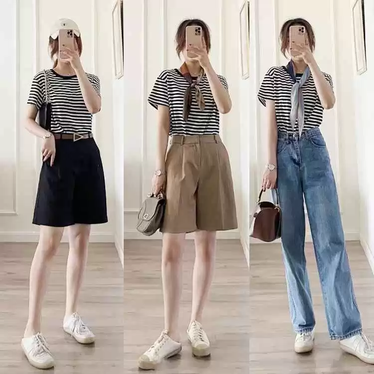 除了纯色T恤,黑白条纹的圆领T恤虽然休闲,但搭配不好容易显单调。试试配高腰五分短裤,打造帅气休闲风,脚踩白色帆布拖鞋,减龄又随性。或者用短款条纹T恤搭高腰牛仔裤,突出身材比例,清爽又时髦。
