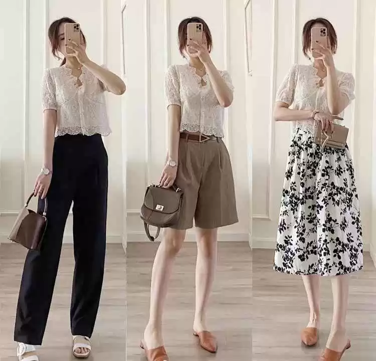 带蕾丝花纹的白色短袖,虽然女人味十足,但搭配不当容易显老气。建议搭配纯色高腰短裤或西装裤,突出利落感,中和甜美度,让整体造型又帅又靓。