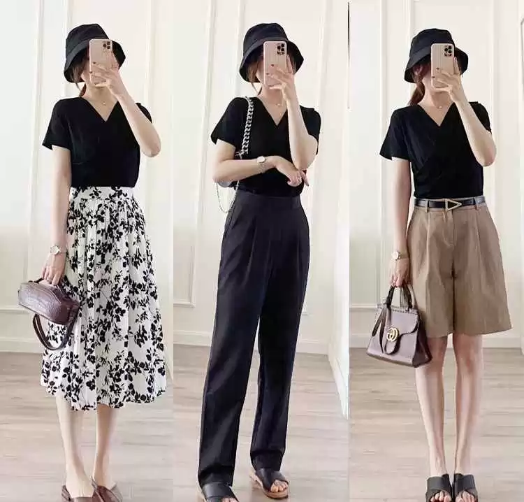 V领设计的黑色T恤能拉长脖颈线条,显脸小。无论是配裤子还是裙子,都大方得体,轻松穿出精致感。