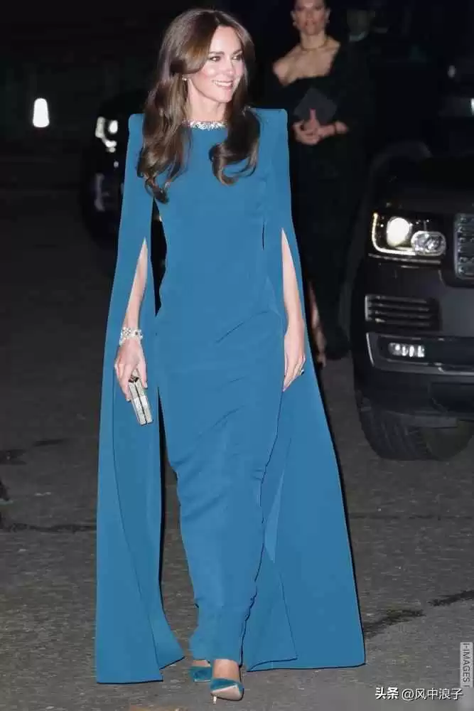 2023年,她又玩新花样。萨菲亚的海神蓝礼服,搭配硬朗垫肩和斗篷袖,整个人看起来更有气场。同色系高跟鞋和银色手拿包,把“现代王室风”融入了每个细节——这时候的凯特,已经不是“在学习规则”,而是在“定义规则”了。