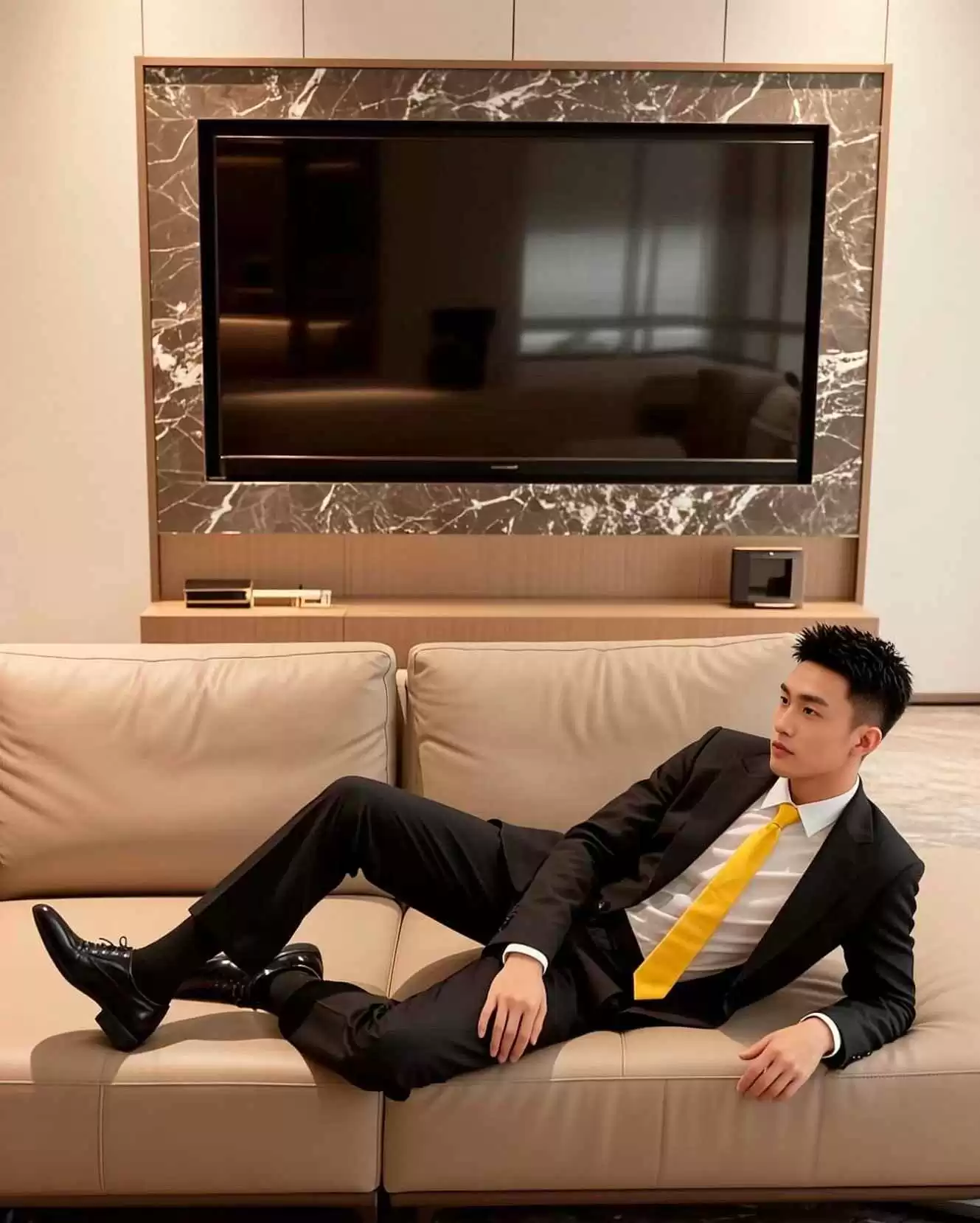 ▫️黑西装加黄领带:用亮色点缀打破沉闷,慵懒地靠在沙发上,轻熟松弛感满分,商务场合也能保持自在。