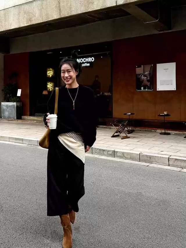 还记得2024年10月北京三里屯的街拍吗?一个女孩穿着焦糖色再生羊毛大衣,配植物皮革半裙,脚踩哑光金乐福鞋,走了十步路,衣服颜色没变,但光影交错:针织吸光、皮革折光、金属反光,效果超吸睛。