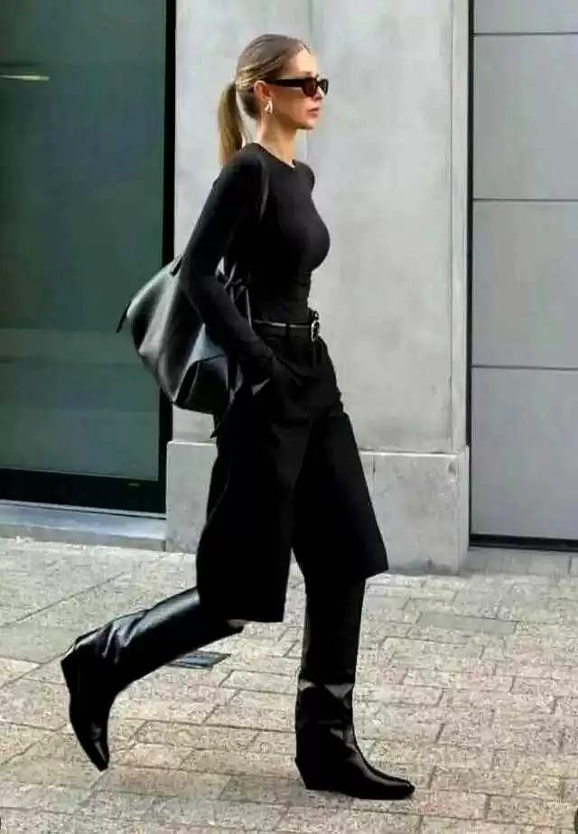 基础色系里,同色或近似色搭配最高级,比如深棕衬衫配同色阔腿裤加黑靴子,霸气又时髦。