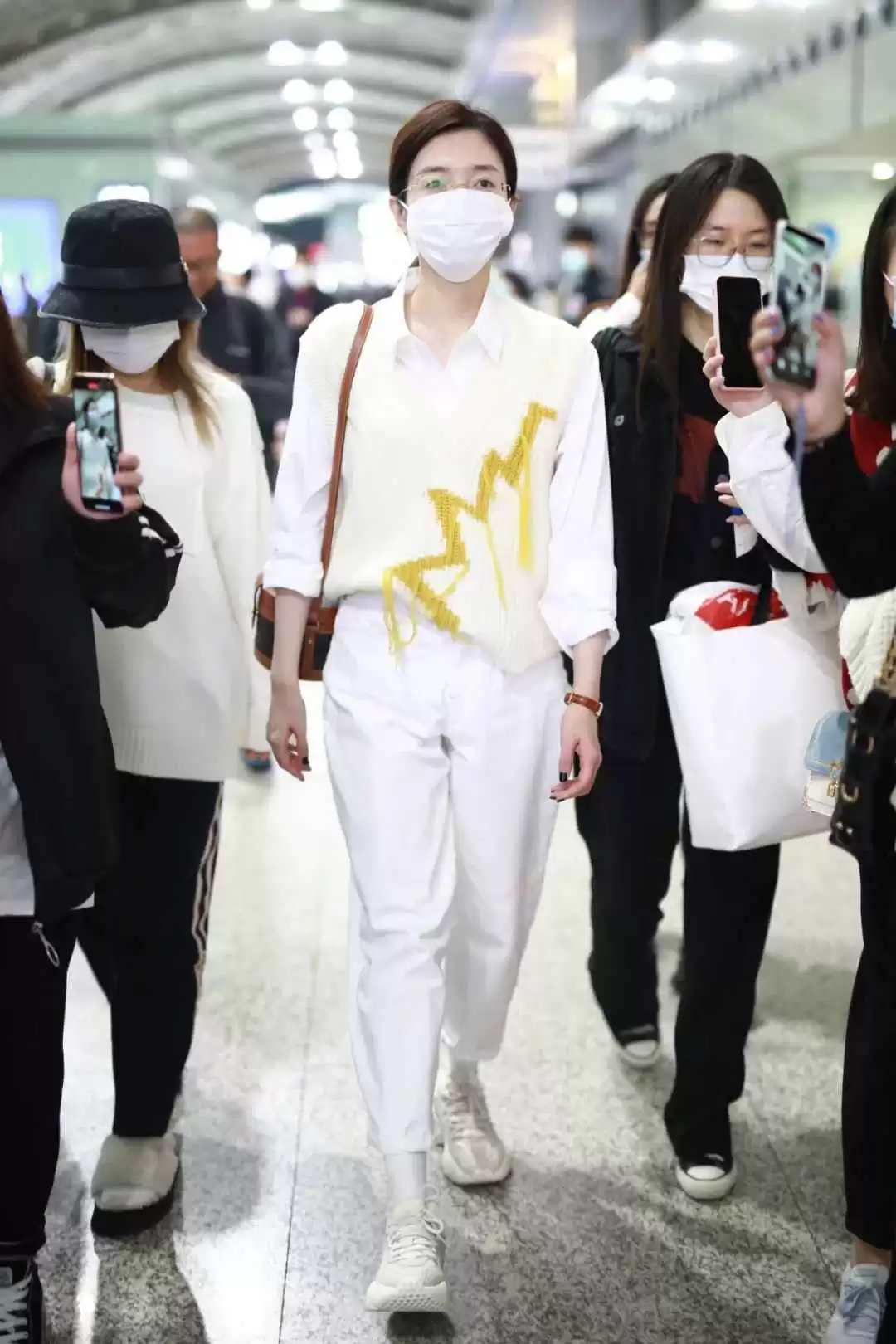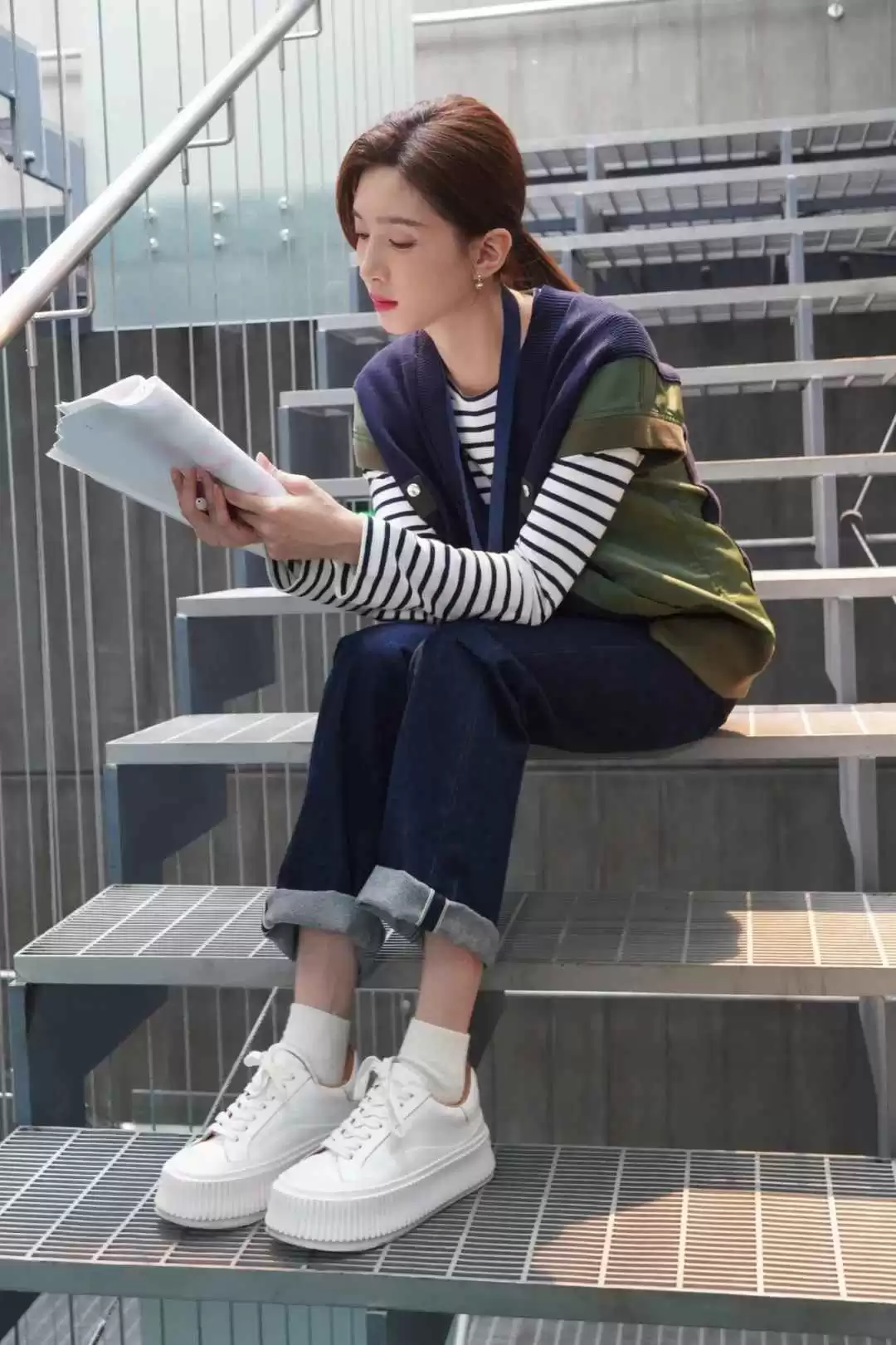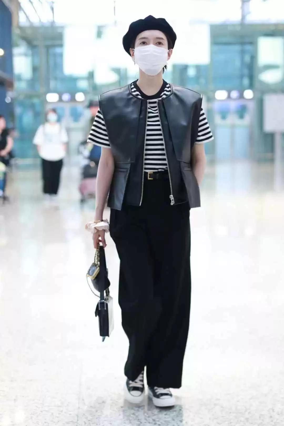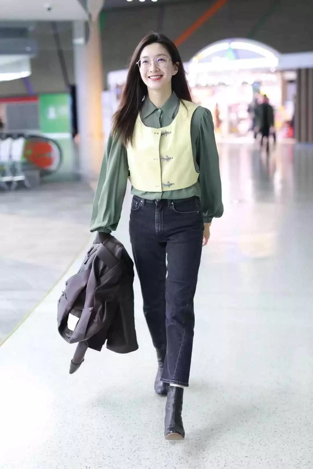 打底加马甲的穿法适合秋天温差大,她用贝雷帽和眼镜营造氛围,把基础款穿出都市精英感。