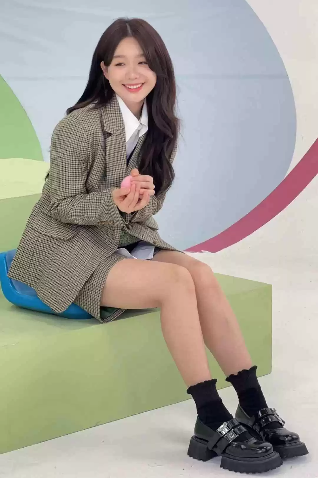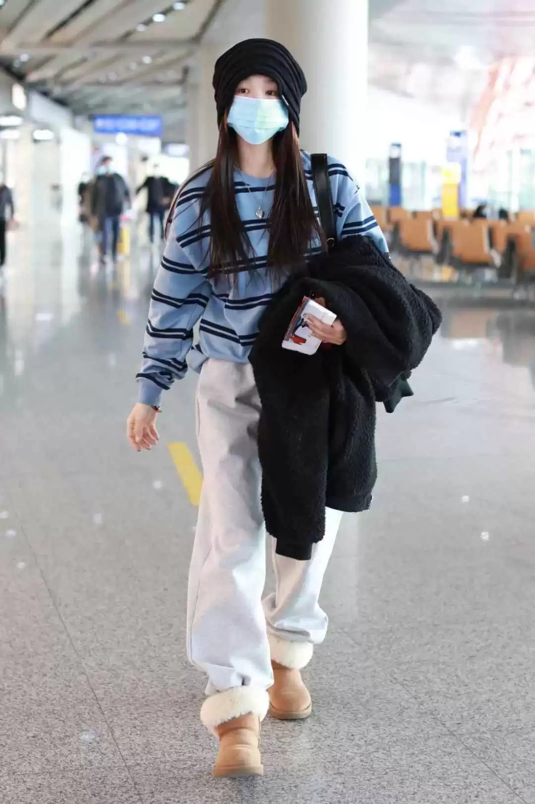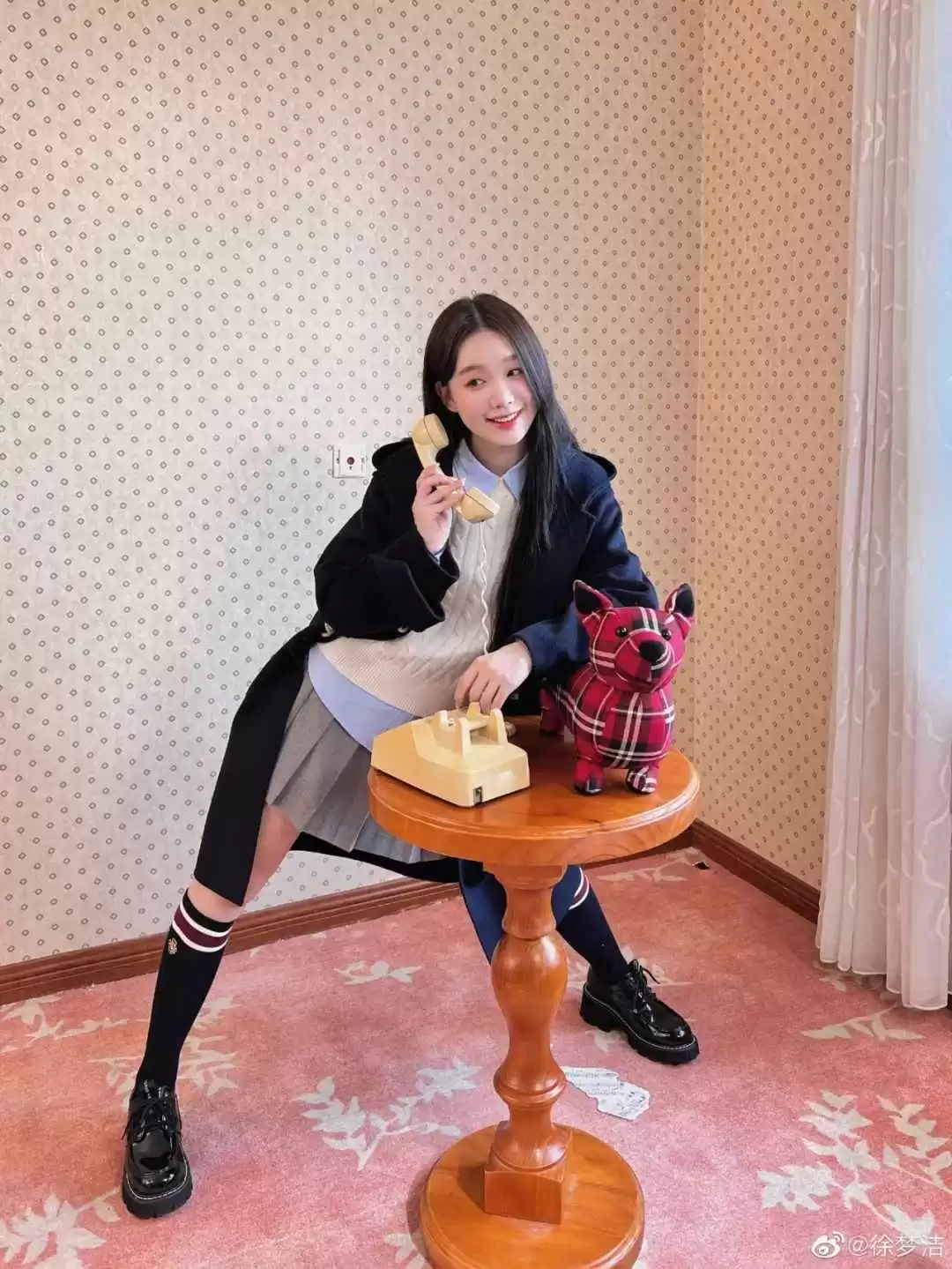 学院风制服很适合徐梦洁,她私下常穿,单品选得用心,比如连帽牛角扣大衣,条纹袜子提亮整体。