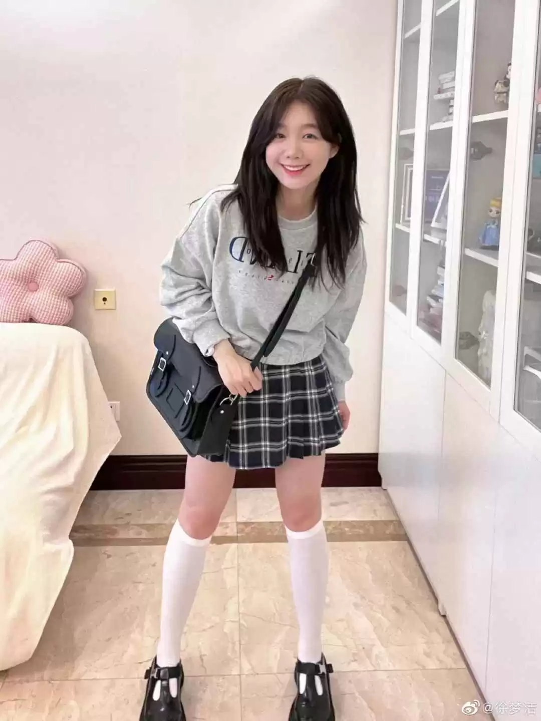 剑桥包和玛丽珍鞋增加学生气,让她的少女感更清新。
