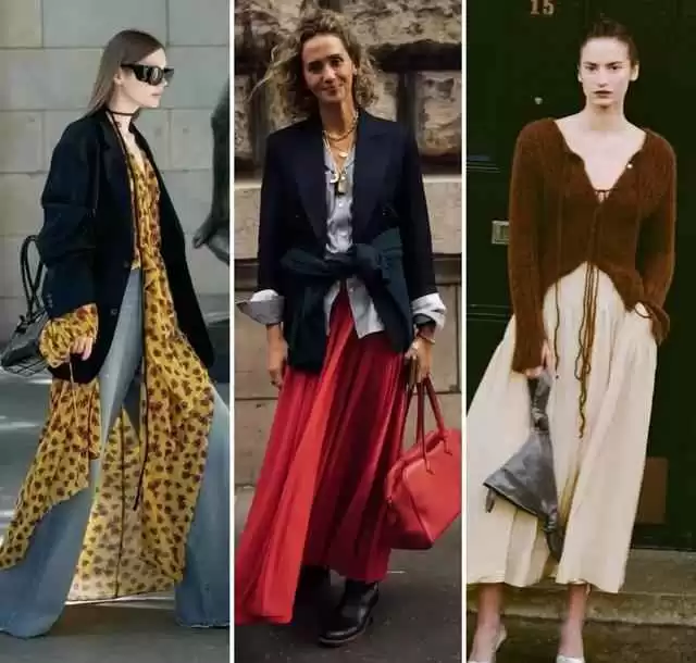 2022年春季流行长裙配马丁靴,或者单穿打底裙,外加薄外套。风格偏向休闲和复古,颜色以大地色系为主,穿出个性又不失温度。