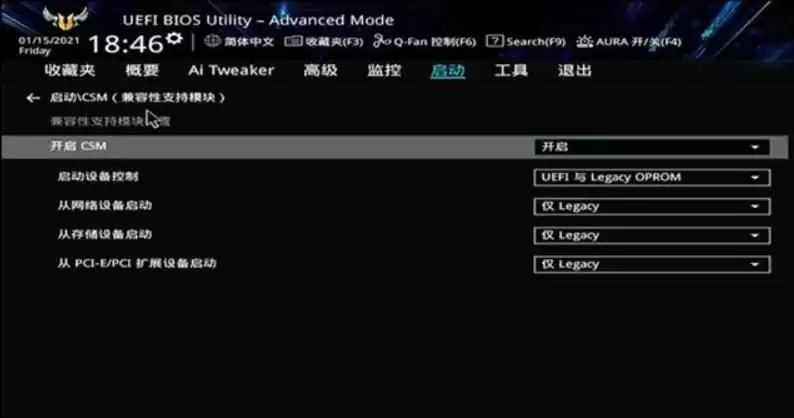 前几年的主板还支持CSM兼容模式,下面举例说明开启方法。