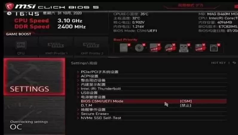 问:BIOS里没有CSM兼容模式,怎么装Win7?