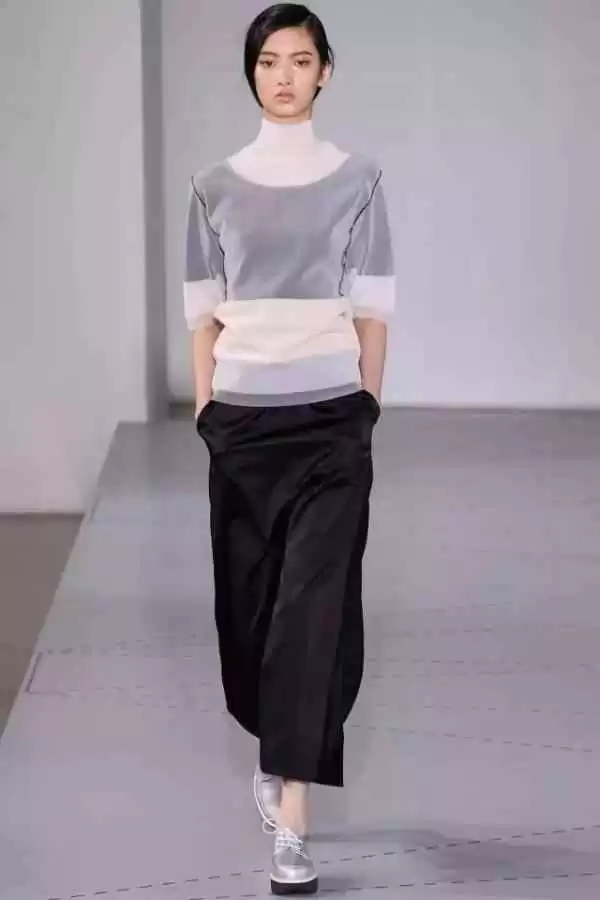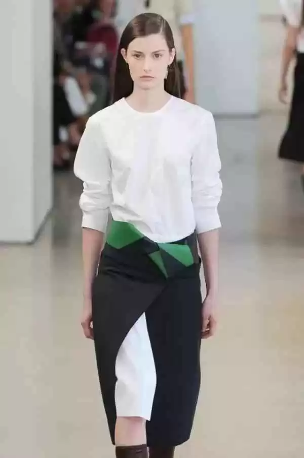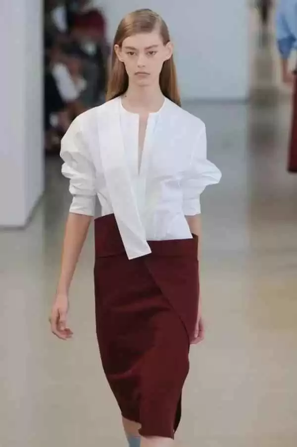 咱们经常在时尚秀上看到各种新奇搭配,比如图中这套穿搭,设计师把衬衫和裙子结合了空间和几何元素,配色也很时髦,深红褐色能突出成熟女性的韵味。