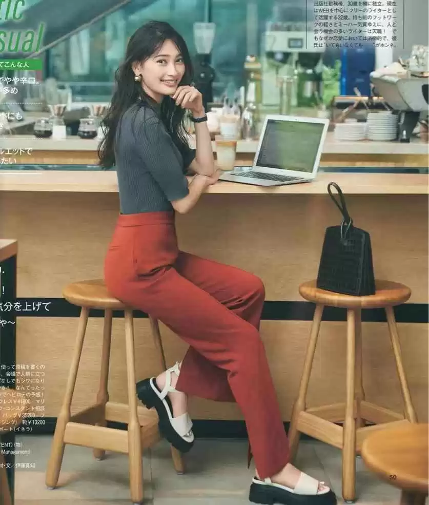 这条红裤并非鲜亮红色,而是融入橙黑调,降低浮夸感,更显质感。搭配深灰色针织T恤,凸显温柔女人味。厚底凉鞋的混搭,增添休闲优雅感,一眼吸睛。