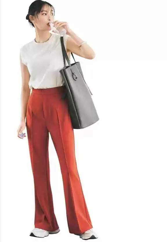 无袖T恤不仅休闲,还带点小性感,提升优雅感。搭配红色直筒裤,微喇裤脚增添女性曲线。老爹鞋的加入,平衡潮酷与精致。