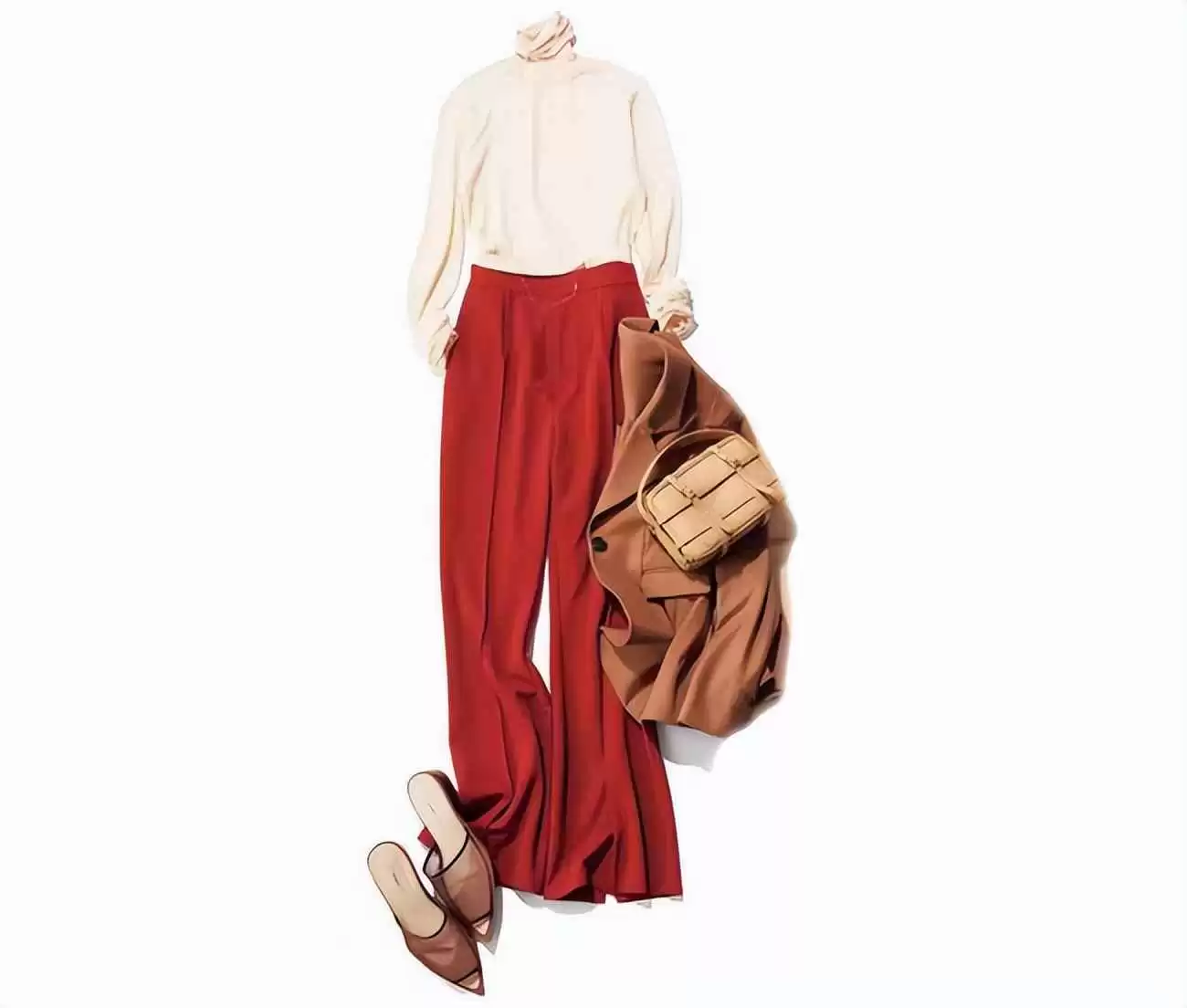 米色针织衫和尖头凉鞋让红裤穿搭更妩媚。外搭棕色西装,演绎米、红、棕的高雅配色。喜欢红色的话,千万别错过这组配色,时髦又优雅。