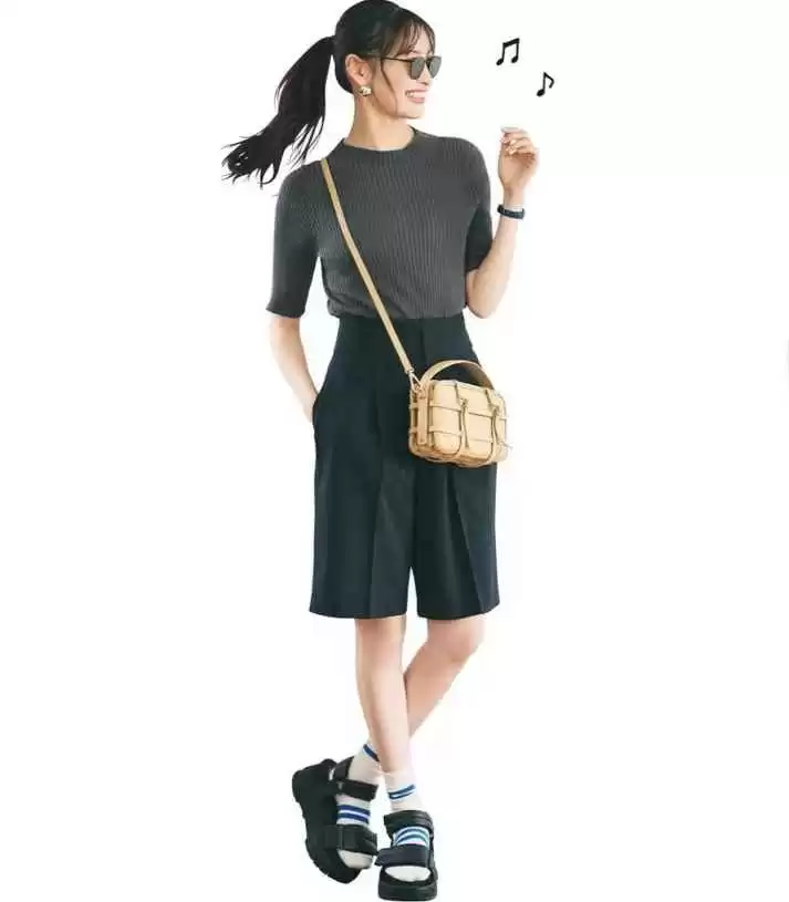 黑色中裤是夏季经典,颜色低调,长度适中。搭配灰色针织衫和潮酷凉鞋,打造休闲中性风。米色包包斜背,打破沉稳,凸显配饰妙用。