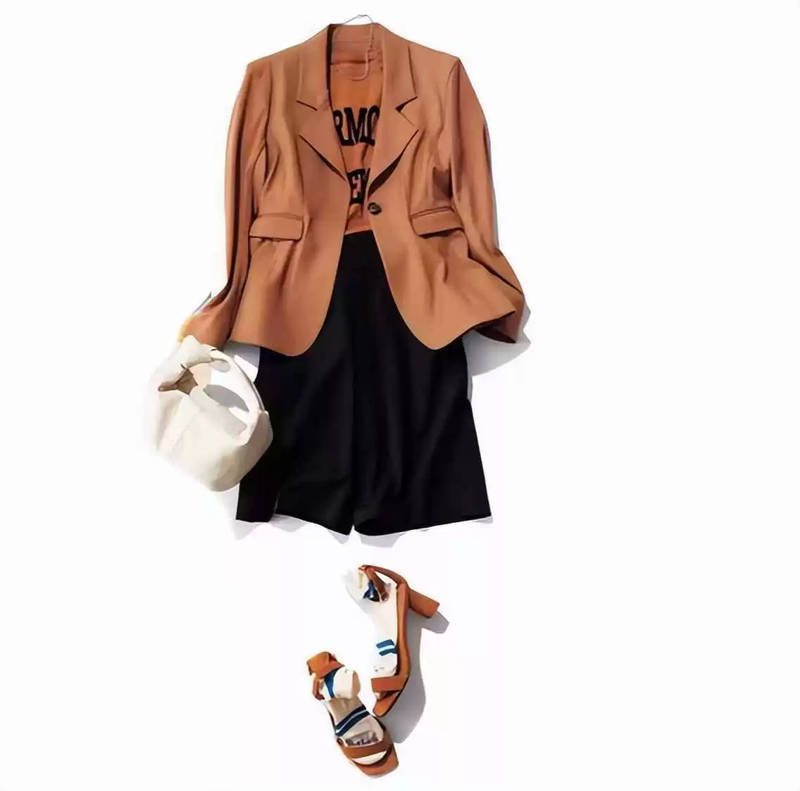 换成棕色T恤和西装,搭配高跟凉鞋,是黑色中裤的通勤造型。自上而下的棕色呼应,提升高级感。普通穿搭的秘诀在于用心搭配。
