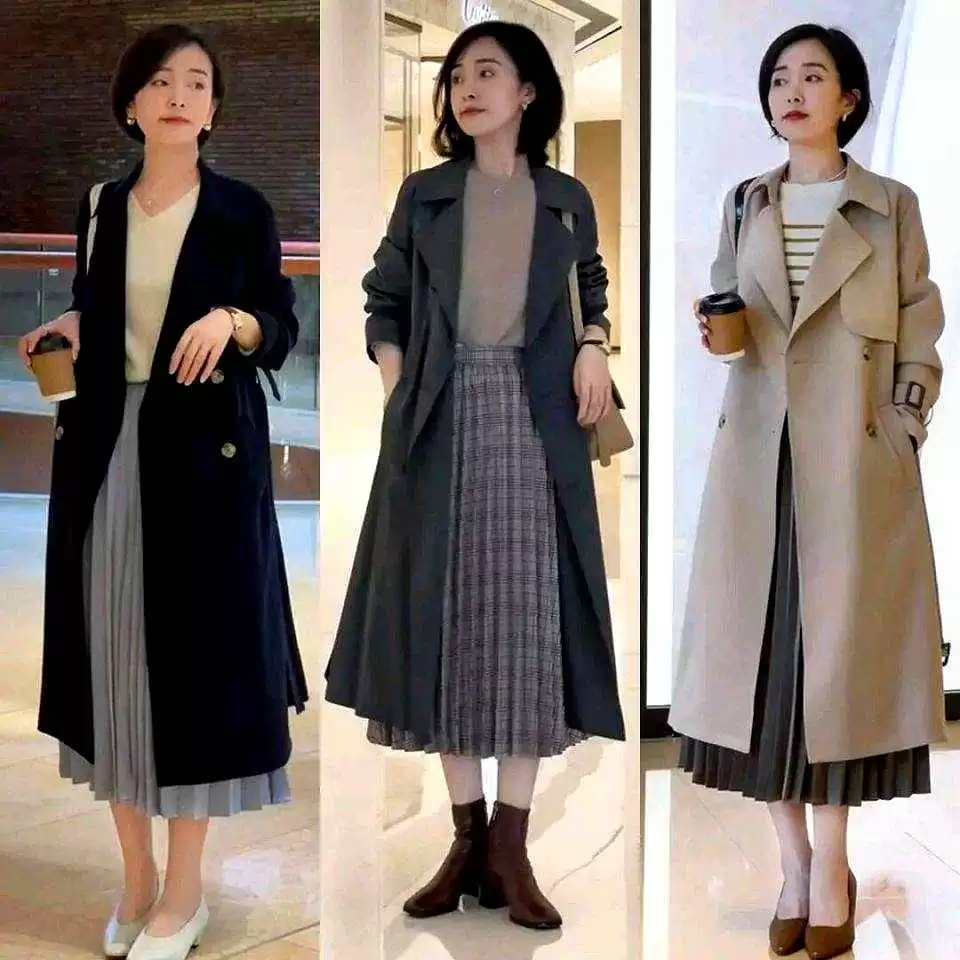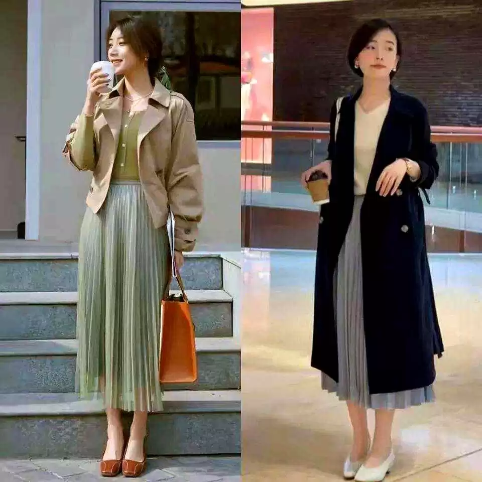 薄纱半裙配白衬衫和卡其风衣,脚上穿小白鞋,随性减龄;想成熟点,雾霾蓝或灰色百褶裙配藏蓝或灰风衣,整个人显得安静高级。