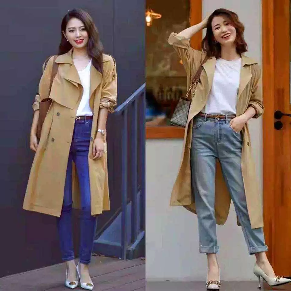 想休闲点,卡其风衣+白T+蓝色牛仔裤,配高跟鞋或小白鞋,通勤和周末都能搞定。