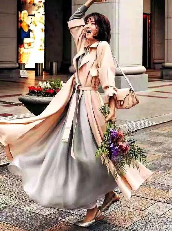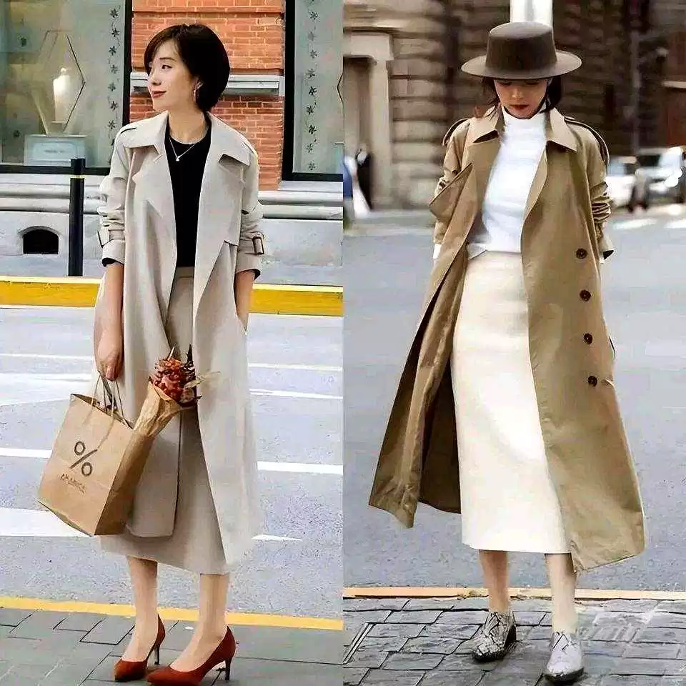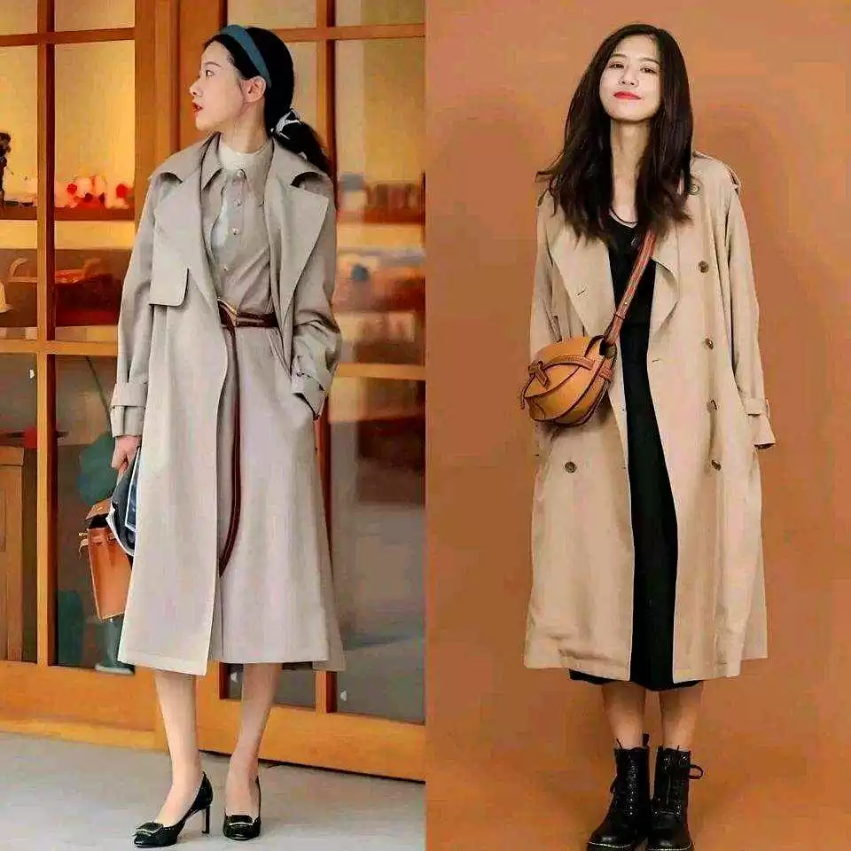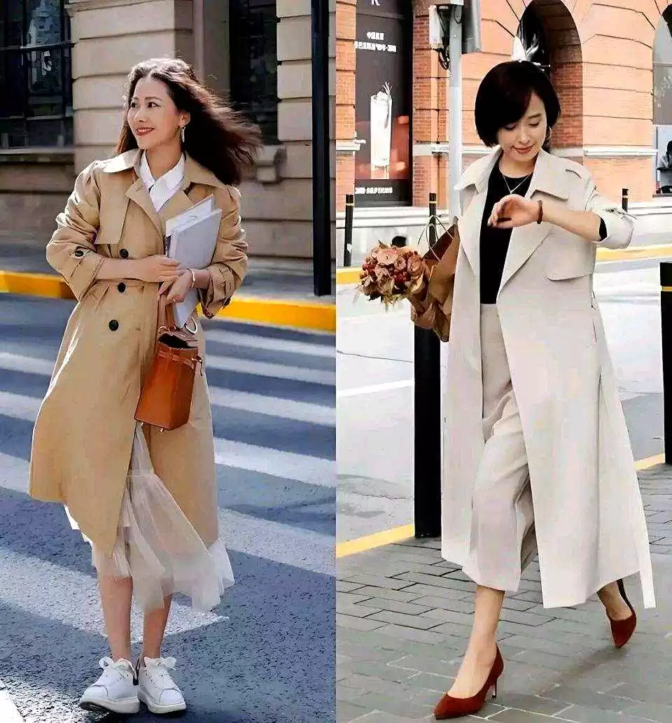 风衣自带腰带时,系个结或打蝴蝶结,腰线更明显;包包颜色和内搭或鞋子呼应,整体更协调。