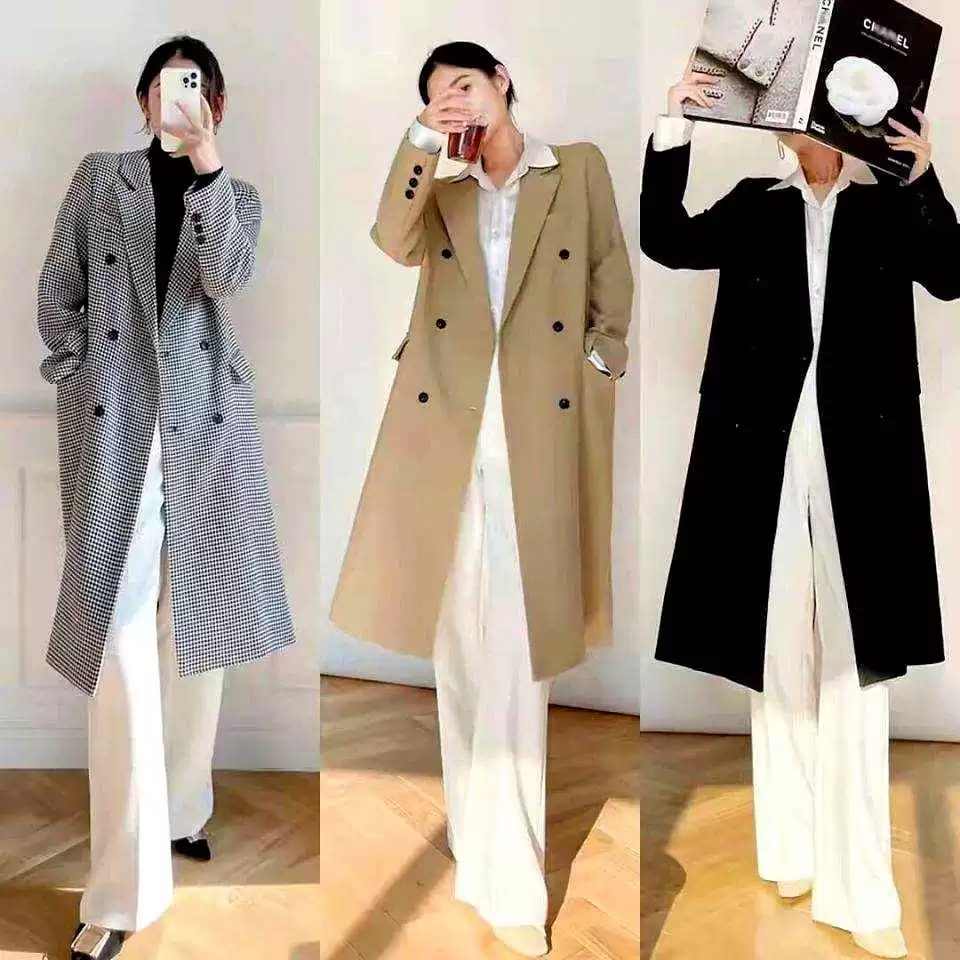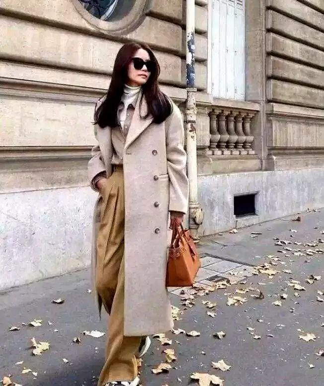 怕冷的北方姐妹,直接把风衣换成大衣,颜色搭配思路一样:藏蓝或灰色大衣+卡其阔腿裤+细针织,保暖和气质兼得。