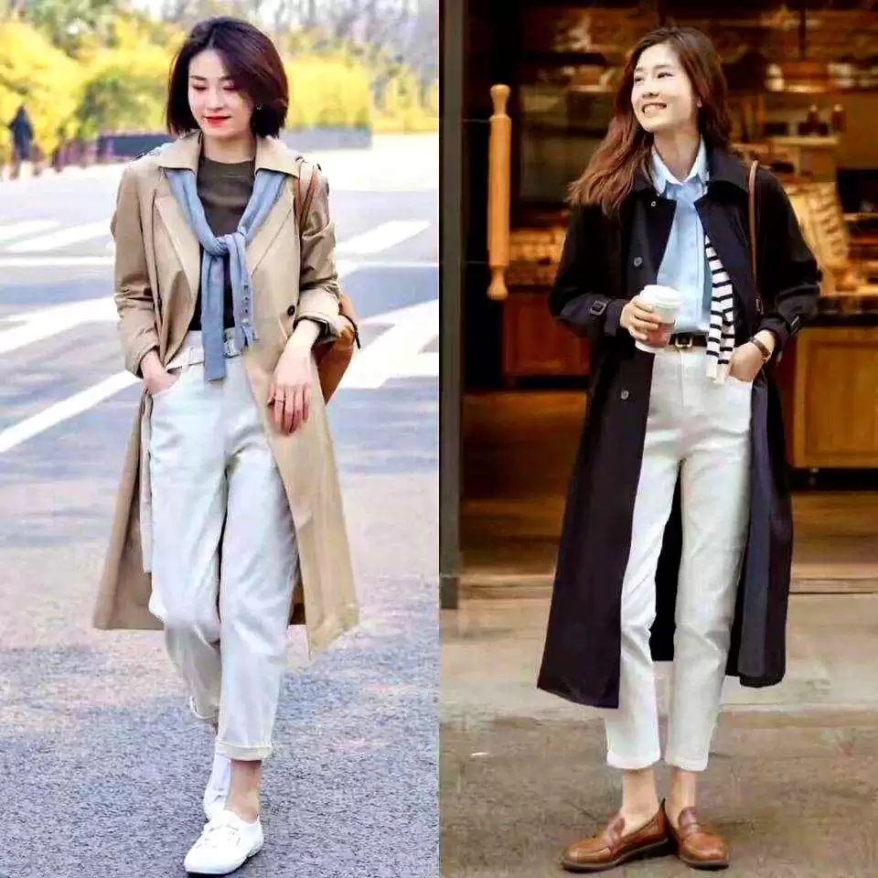 卡其风衣配印花衬衫和浅卡其西裤,脚踩白色乐福鞋,优雅又犀利;黑风衣配浅蓝衬衫和白色牛仔裤,穿双棕色乐福鞋,会议室里也能轻松有型。