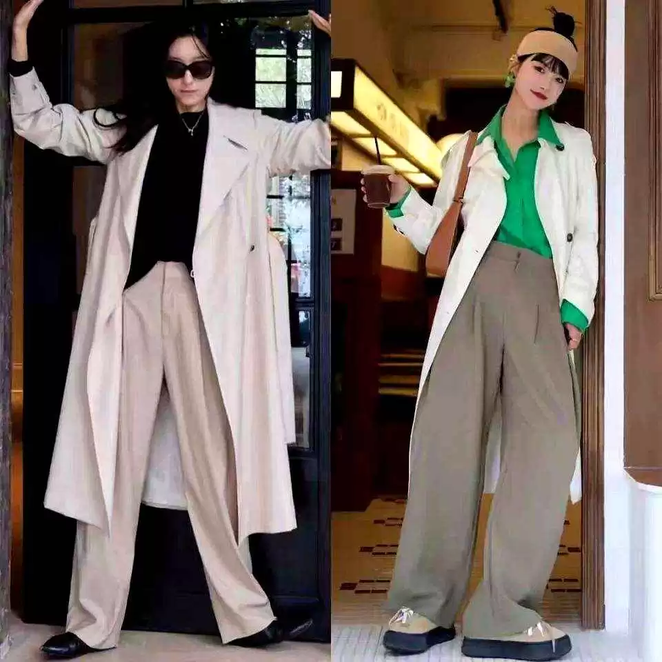 比如卡其风衣配浅卡其西裤,内搭白T或白衬衫,干净显贵;黑风衣配浅蓝衬衫和白色牛仔裤,利落清爽;白风衣叠穿绿色衬衫,下面配卡其直筒裤,轻微撞色,时髦感立马有。