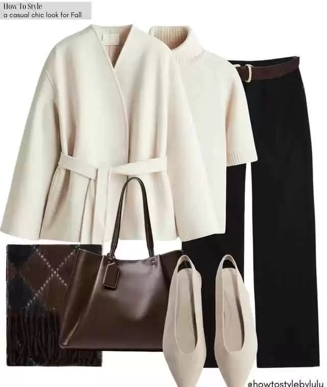 比如,一件短款奶油白外套配淡咖色阔腿裤,再加一双短靴,就能轻松打造利落优雅的look。