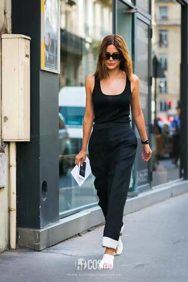 黑色小背心和黑裤子搭配起来超级时髦!既性感又大气,而且同色系搭配不用担心出错。两种显瘦的颜色组合在一起,让你更有型。