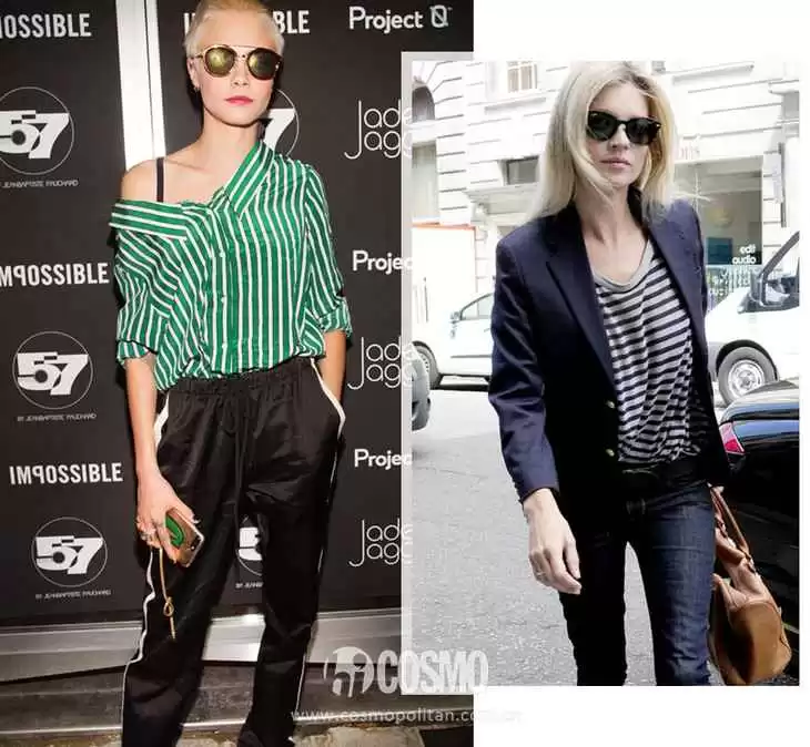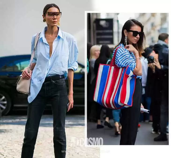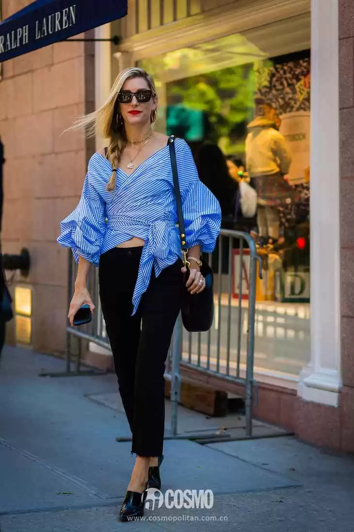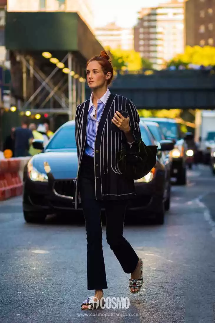 清爽的条纹衫,尤其是今年流行的蓝白条纹,搭配黑裤子最合适。蓝白条纹容易显得轻飘,配上黑裤子就能增加整体质感。